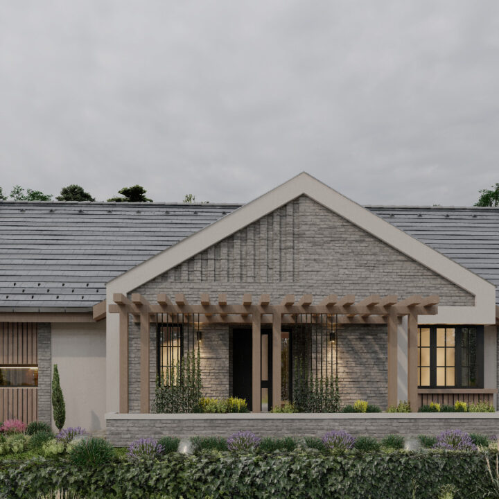 A keresztszárny nyeregtetős kialakítása finoman hangsúlyozza a főbejáratot, ahol a hagyományos és a kortárs elemek harmonikusan találkoznak. A pergola itt már tornácszerű fogadótérként jelenik meg, barátságos átmenetet teremtve a külső és belső terek között.
