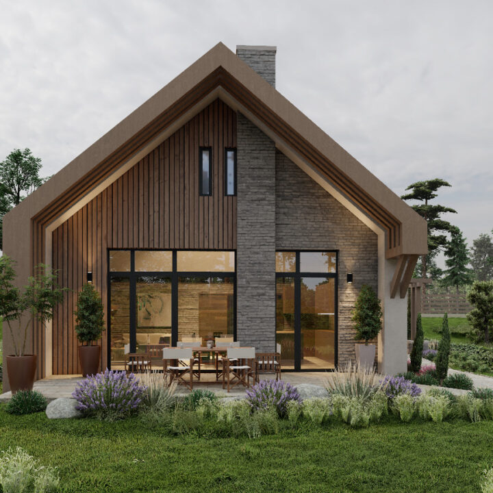 Az anyaghasználat természetes és időtálló: kőburkolat, függőleges osztású deszkaburkolat és vakolt felületek adják az épület karakterét. A tető antracit cserepezése és a nyílászárók sötét tokszerkezete az építtetői igényeknek megfelelően emeli ki a modern hangulatot.