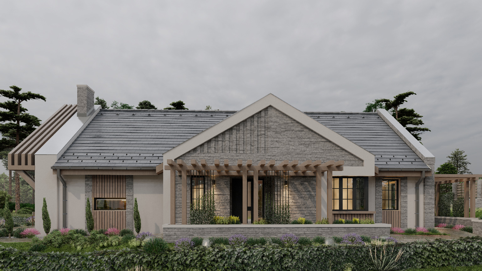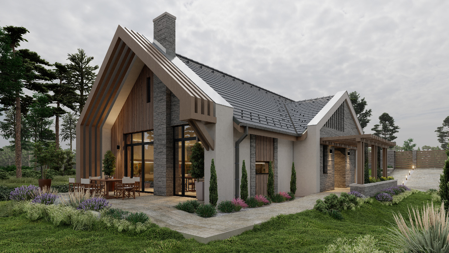 A keresztszárny nyeregtetős kialakítása finoman hangsúlyozza a főbejáratot, ahol a hagyományos és a kortárs elemek harmonikusan találkoznak. A pergola itt már tornácszerű fogadótérként jelenik meg, barátságos átmenetet teremtve a külső és belső terek között.
