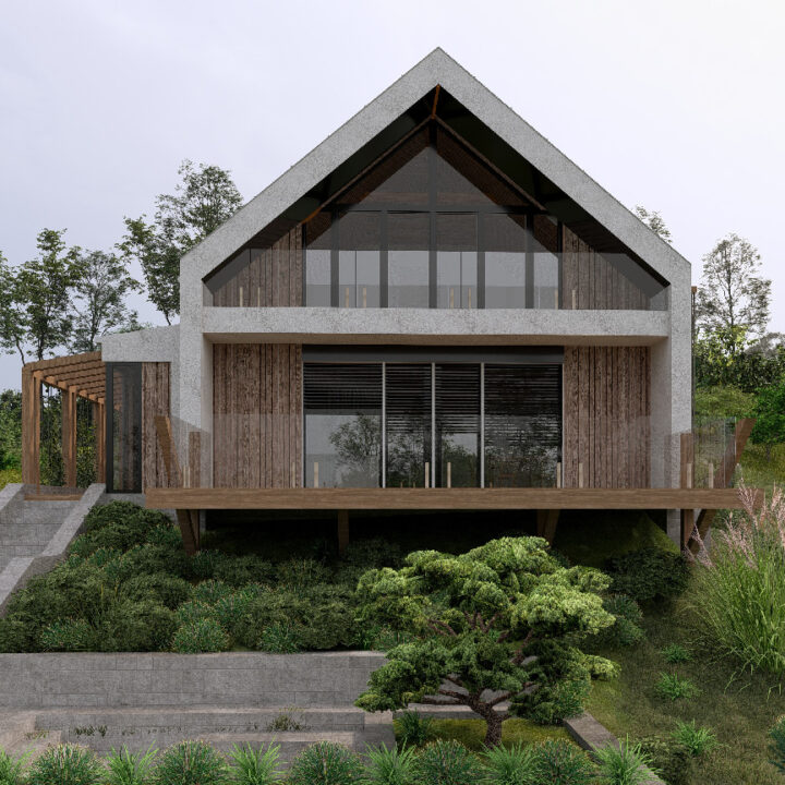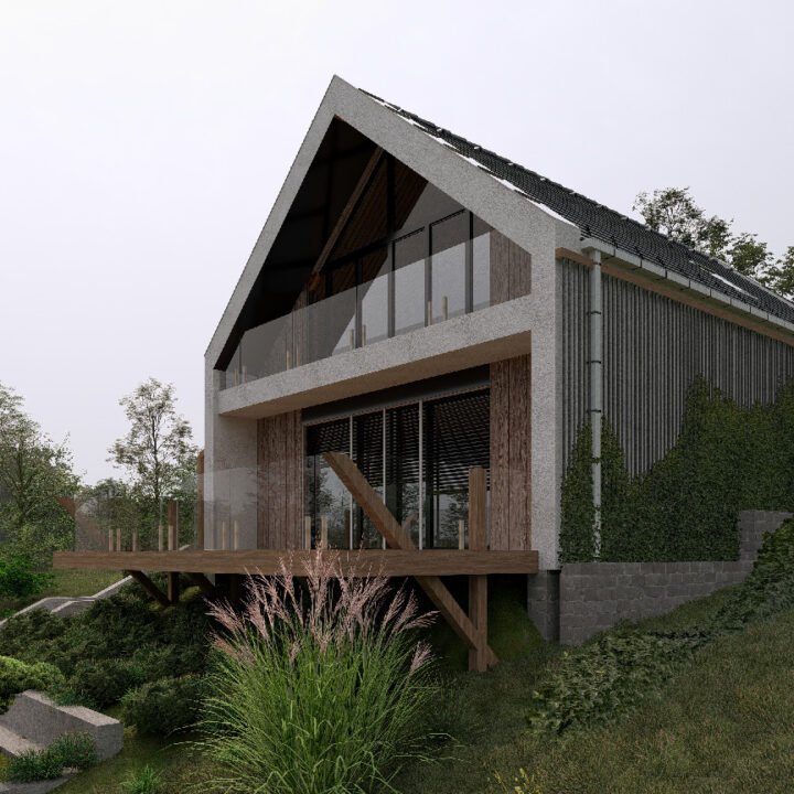 A tervezés során az építtetővel közösen egy letisztult formavilágú, modern, mégis időtálló lakóépületet alkottunk. Az egyszerű nyeregtetős tömeg földszint + tetőtér-beépítéses kialakítású, arányait és magasságát a helyi szabályozás határozta meg.
