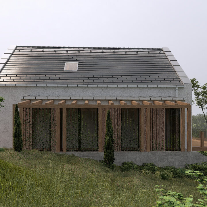 A fő épülettömeghez oldalirányból egy könnyedebb, alárendelt elem kapcsolódik, amely előtérként és télikertként funkcionál. Az előtér tetővonalát meghosszabbítva készül egy pergola szerkezet acél sodronnyal melyre később futónövények kerülnek felfuttatásra. A pergola alatt átsétálva jutunk el tereplépcsőn keresztül a hátsókertbe.