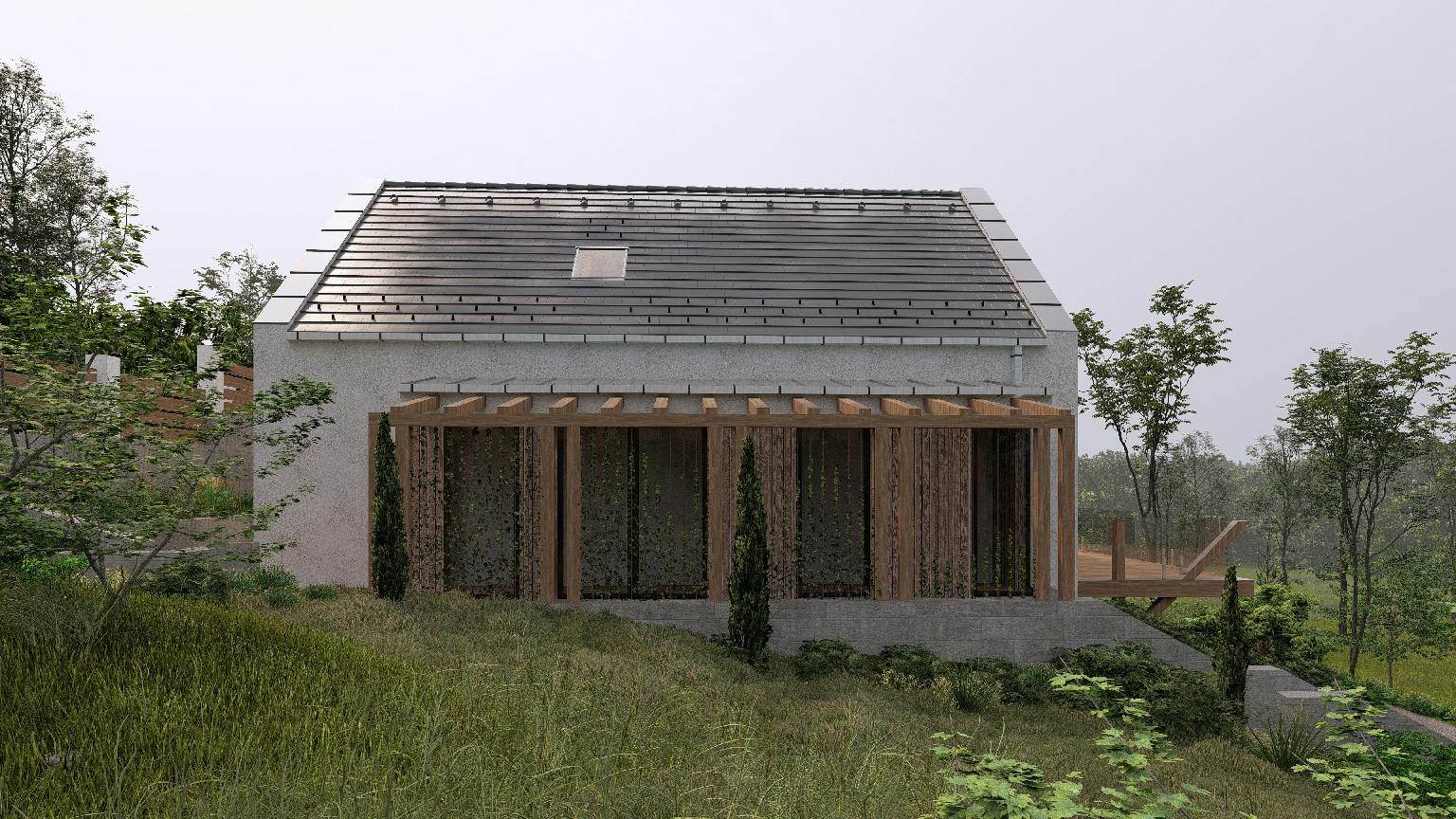 A fő épülettömeghez oldalirányból egy könnyedebb, alárendelt elem kapcsolódik, amely előtérként és télikertként funkcionál. Az előtér tetővonalát meghosszabbítva készül egy pergola szerkezet acél sodronnyal melyre később futónövények kerülnek felfuttatásra. A pergola alatt átsétálva jutunk el tereplépcsőn keresztül a hátsókertbe.