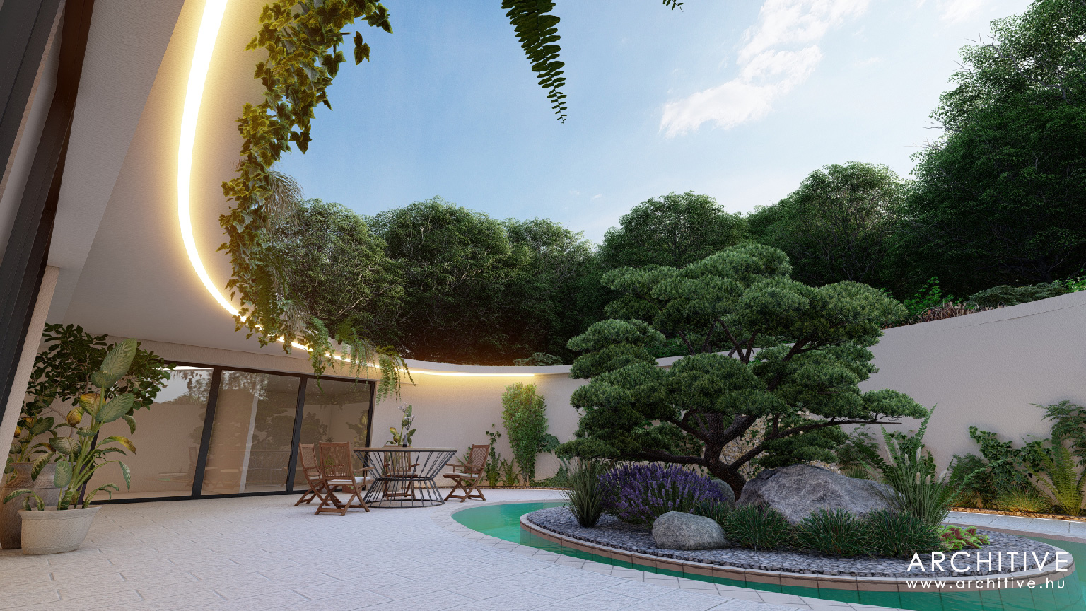 - A domboldal fele egy átriumszerű megnyitás mely jellemzően a lakószobák és dolgozó megvilágítását szolgálja. A belső teraszos tér közepén egy látványmedence és abban egy kisebb zöld sziget került megtervezésre.